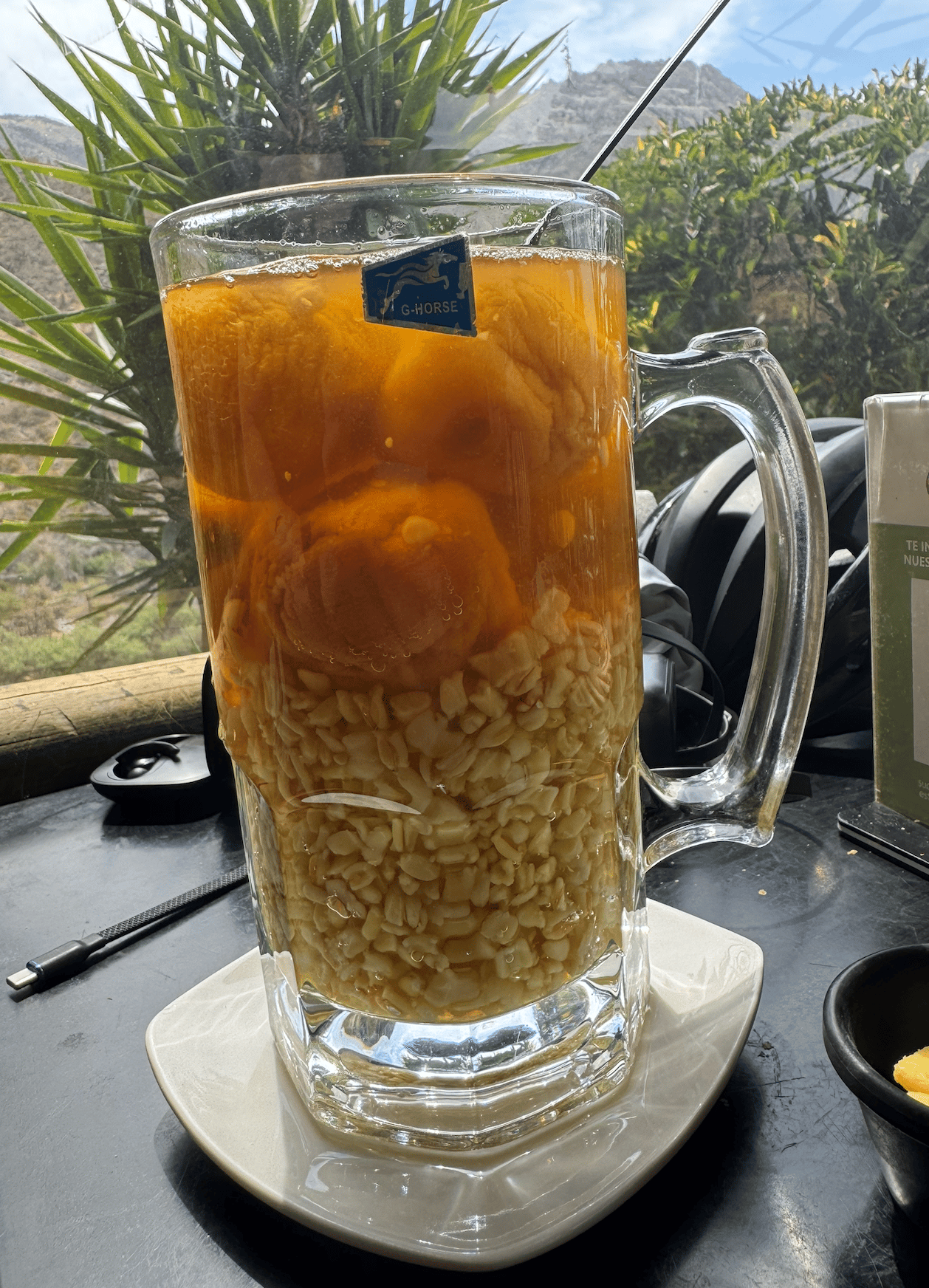 Then came a monte con huesillo, a traditional summer-time drink consisting of a sweet clear nectar-like liquid made with dried peaches (huesillo) cooked in sugar, water and cinnamon and then once cooled, mixed with fresh cooked husked wheat berries (mote).